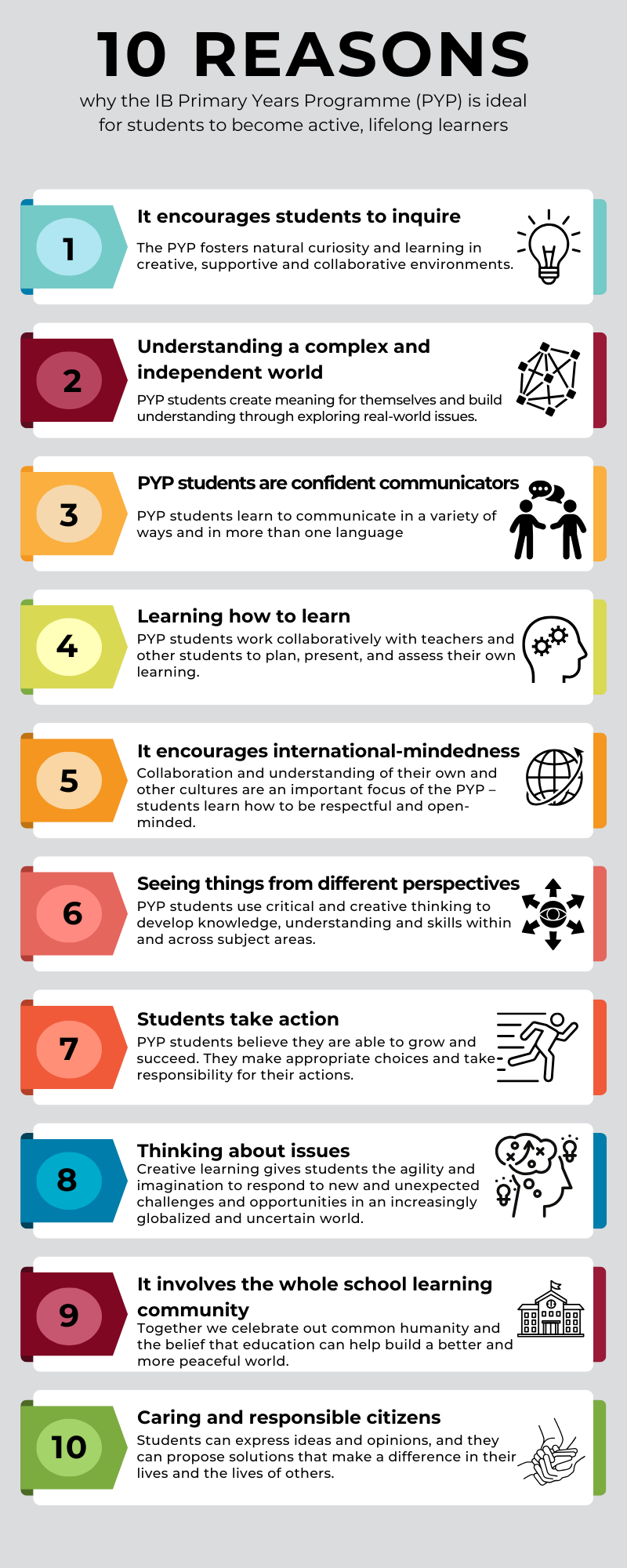 The Learner Profile includes ten (10) attributes that are understood to describe an effective lifelong learner. As the guiding light of all IB programs, we intentionally weave learning opportunities that develop these attributes throughout the curriculum. This development of these attributes begins with our youngest learners, however it is understood to be an ongoing process - not a goal to be reached and checked off by year’s end. All constituents are expected to be aware of the Learner Profile, as well as to engage in the purposeful reflection of one’s strengths and areas of improvement within it. (PYP Attitudes have been highlighted in the descriptions below.)